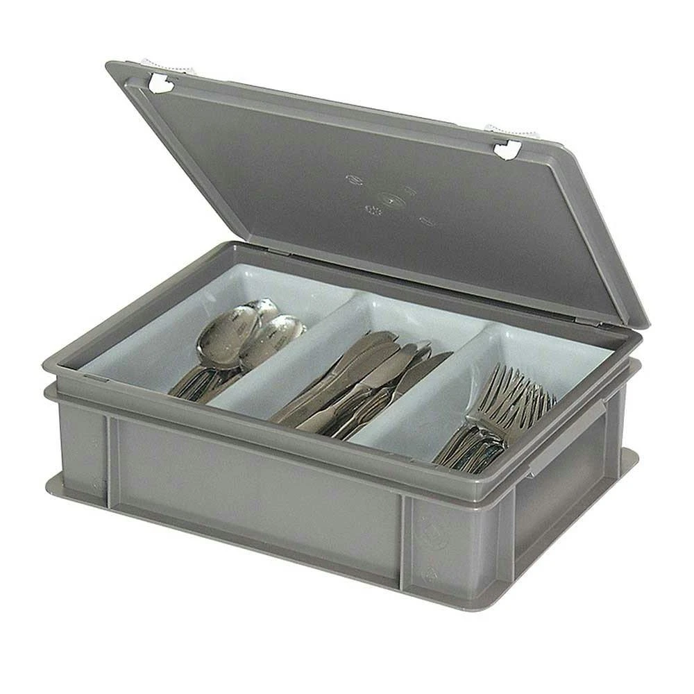 Stabile Kunststoffkoffer mit Scharnierdeckel, 2 Schiebeverschlüssen und grauem 3-Mulden-Einsatz.